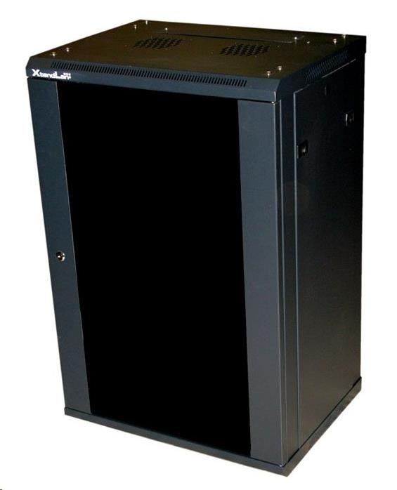XtendLan 19" nástěnný rozvaděč 18U 600x600, nosnost 60 kg, skleněné kouřové dveře, rozložený, černý